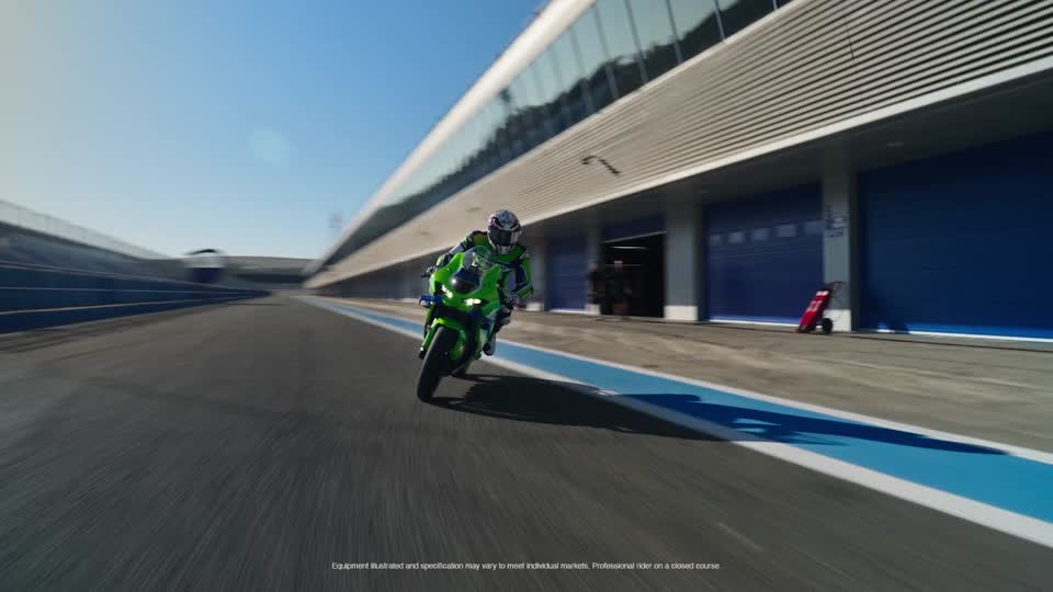 Ninja® ZX™-10R mostrado. Piloto profesional en un curso cerrado. El equipo ilustrado y las especificaciones pueden variar para cumplir con los mercados individuales.